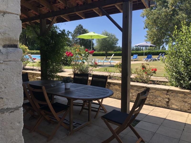 À l'extérieur se trouve votre propre patio privé avec mobilier de jardin en bois et barbecue à gaz, donnant sur la belle piscine et les jardins.